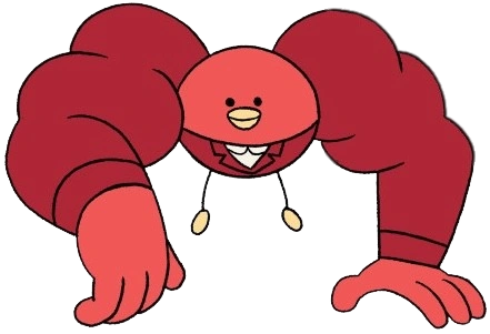 She's a very small, round red bird, with very big, muscular humanoid arms and hands. She has small, black eyes, a yellow beak, and short legs with small yellow feet.