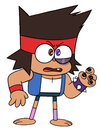 As the name suggests, "Combined" K.O. is half K.O. and half T.K.O. His right side has the characteristics of K.O, like his normal hairstyle, a brown eye, and bright red wristband. "Combined" K.O.'s left side is similar to T.K.O, with the hairstyle being somewhat spiky and messy, a purple eye, a purple spiked wristband, dark purple eyeshadow with black eyeliner for makeup, and painted black nails. His legwarmers are pink and purple, the right side being like K.O.'s shade of pink, while the left is T.K.O's shade of purple. He still wears the same blue vest, white tank top, bright red headband, and dark blue shorts that K.O. regularly wears.