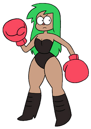 Judy has the same pear-figure body build and the same height as Enid. She has a long, waist-length vibrant green hair and a somewhat dark tan skin. She wears a sleeveless black full piece leotard-bodysuit with a sweetheart neckline and matching calf-length black boots and wears big red boxing gloves, which she is born with on her fists.[2] Unlike the rest of her family, she has very huge and thick legs and slim arms.