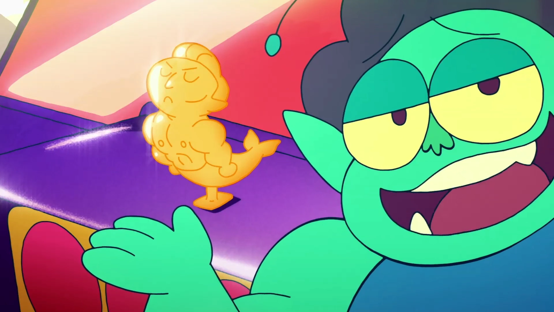 Radicles displays his van in the plaza's parking lot. He then regales K.O. with its impressive features such as a powerful Nitro v6 engine, tires with hubcaps, sunroof, seating, breeze, and artillery (claiming to be all Nitro). K.O. is impressed while Enid is bored. Rad even shows his merman hood ornament valued at a hundred grand. K.O. wants to learn the story of how Rad got it.